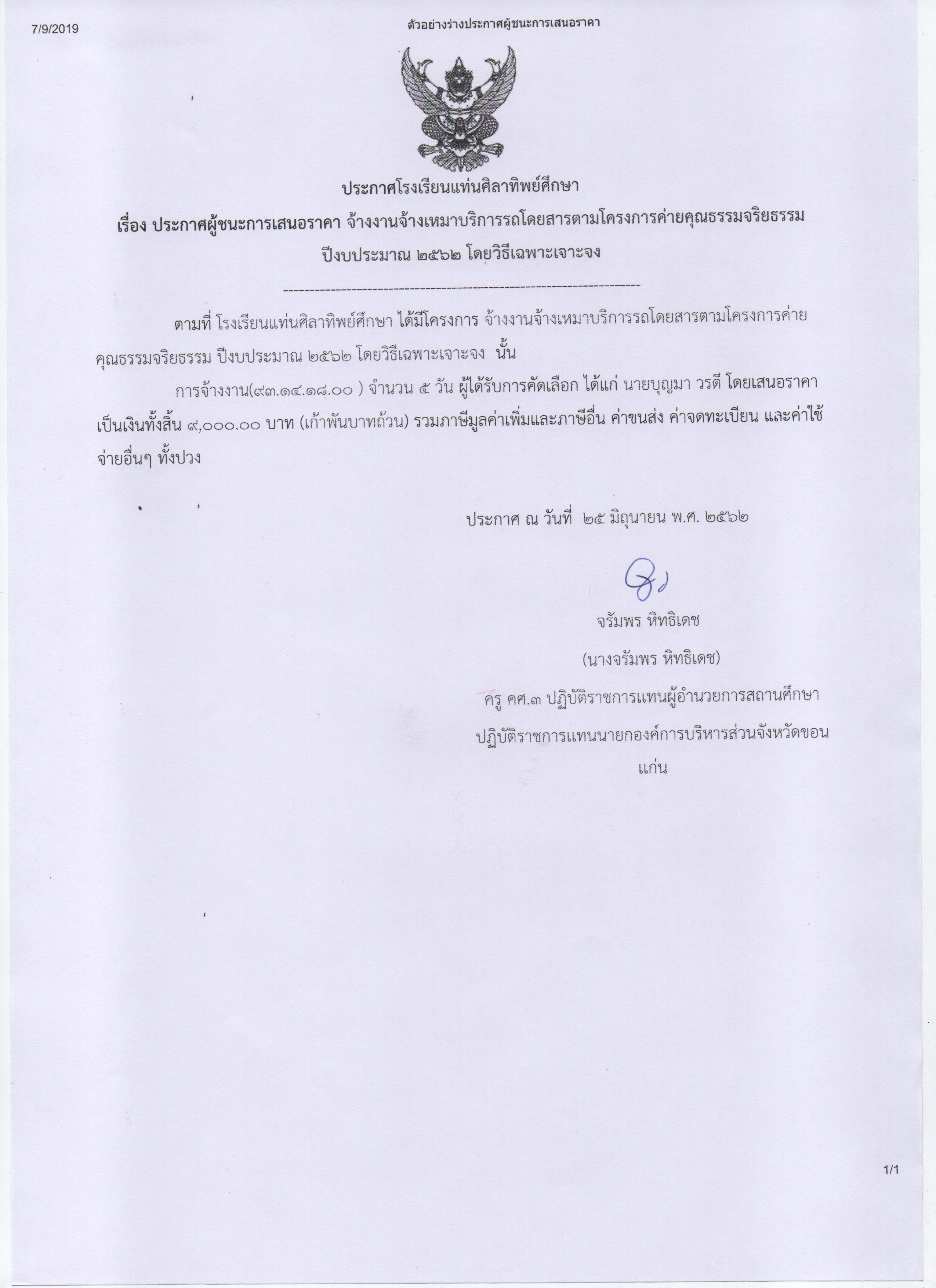 ประกาศผู้ชนะการเสนอราคาค่าวัสดุ ตามโครงการพัฒนาระบบเทคโนโลยีระบบสารสนเทศของสถานศึกษา ปีงบประมาณ ๒๕๖๒ โรงเรียนแท่นศิลาทิพย์ศึกษา สังกัดองค์การบริหารส่วนจังหวัดขอนแก่น