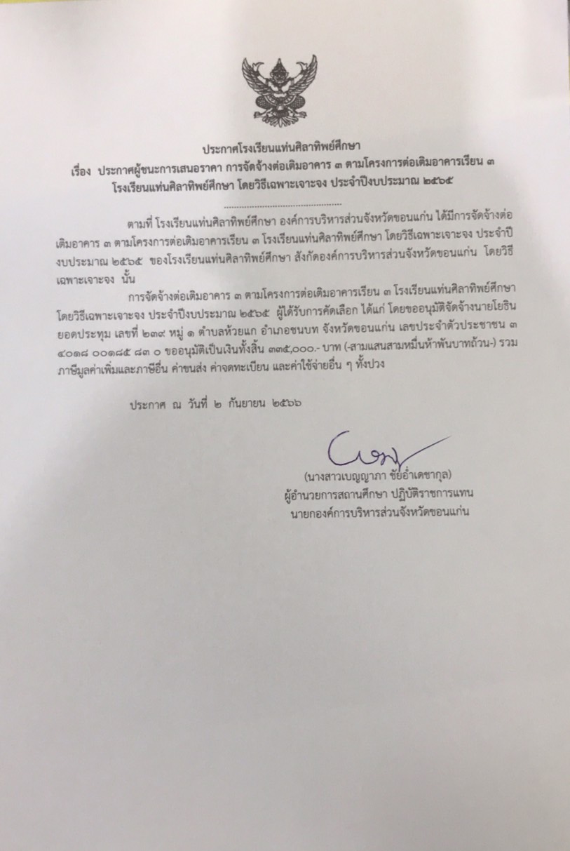 ประกาศผู้ชนะการเสนอราคา การจัดจ้างต่อเติมอาคาร ๓ ตามโครงการต่อเติมอาคารเรียน ๓ ประจำปีงบประมาณ ๒๕๖๖ โรงเรียนแท่นศิลาทิพย์ศึกษา