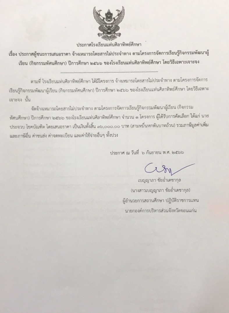 ประกาศผู้ชนะการเสนอราคา จ้างเหมารถโดยสารไม่ประจำทาง ตามโครงการจัดการเรียนรู้กิจกรรมพัฒนาผู้เรียน (กิจกรรมทัศนศึกษา) ประจำปีงบประมาณ ๒๕๖๖ โรงเรียนแท่นศิลาทิพย์ศึกษา