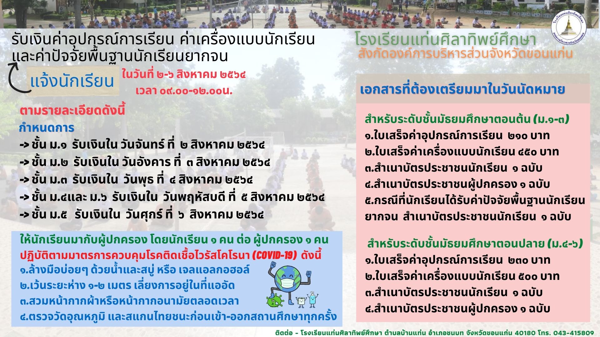 เรื่อง รับเงินค่าอุปกรณ์การเรียน ค่าเครื่องแบบนักเรียน และค่าปัจจัยพื้นฐานนักเรียนยากจน ระหว่างวันที่ 2-6 สิงหาคม 2564 ตามรายละเอียด ดังแนบมานี้