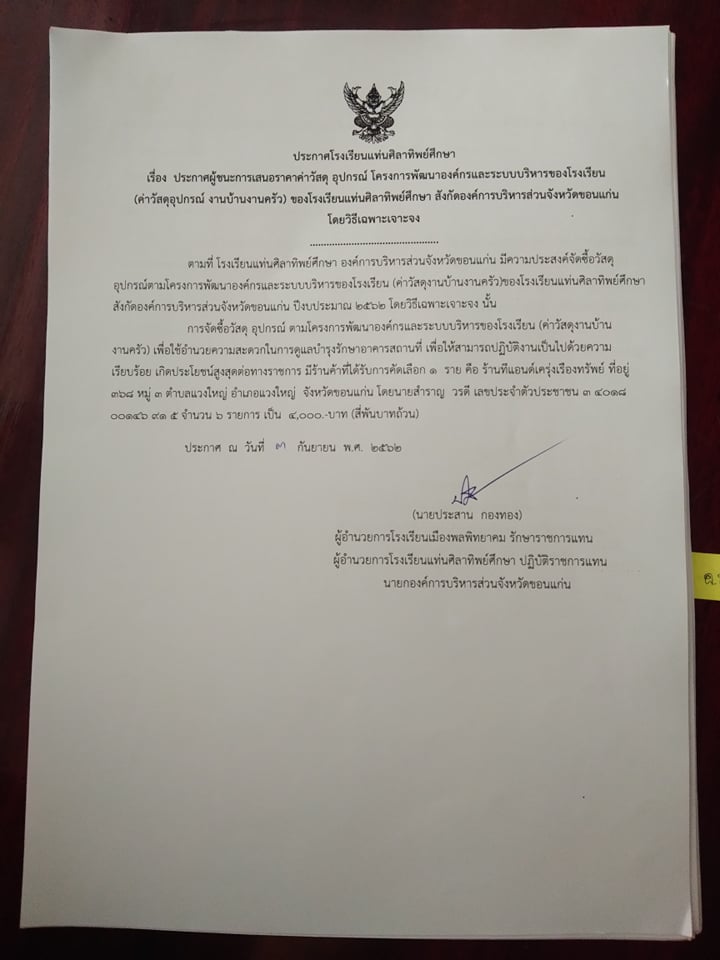 ประกาศโรงเรียนแท่นศิลาทิพย์ศึกษา เรื่อง ประกาศผู้ชนะการเสนอราคา จ้างเหมาบริการอาหารกลางวันสำหรับนักเรียน