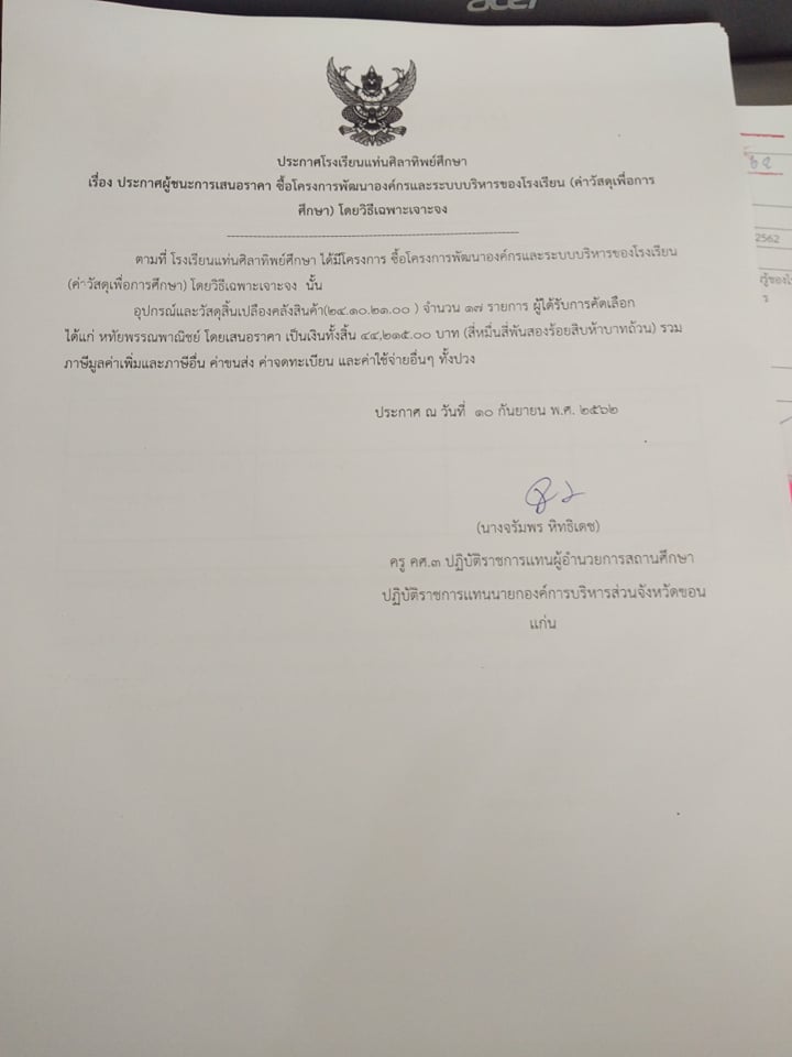 ประกาศผู้ชนะการเสนอราคา ซื้อการบริหารโดยใช้โรงเรียนเป็นฐาน (SBMLD) หลักสูตรเพิ่มเติมสู่ความเป็นเลิศด้านคอมพิวเตอร์ระดับมัธยมศึกษาตอนต้น โดยวิธีเฉพาะเจาะจง