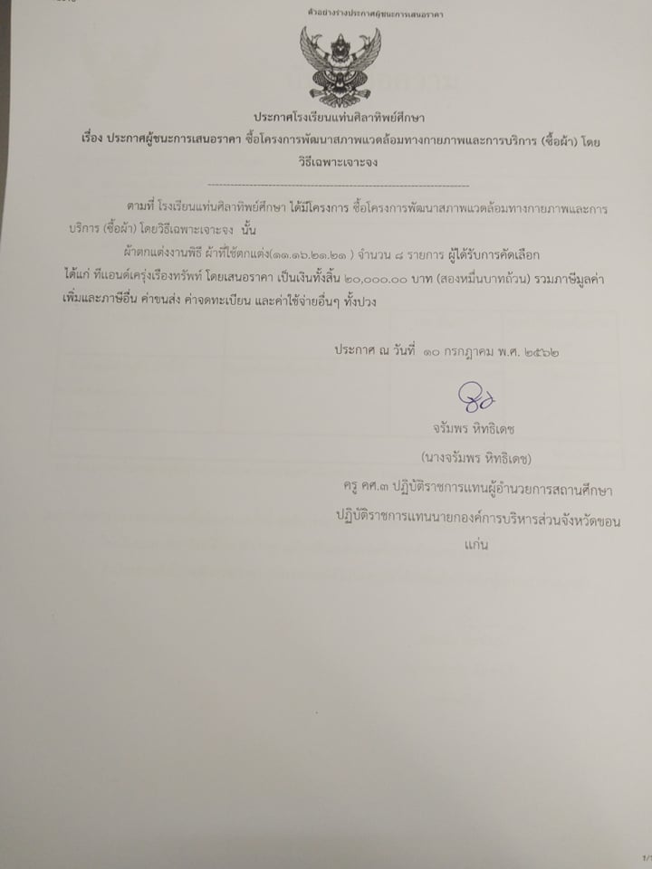 ประกาศโรงเรียนแท่นศิลาทิพย์ศึกษา เรื่อง ประกาศผู้ชนะการเสนอราคาจ้างเหมาบริการบุคคลเพื่อปฏิบัติหน้าที่ครูช่วยสอน