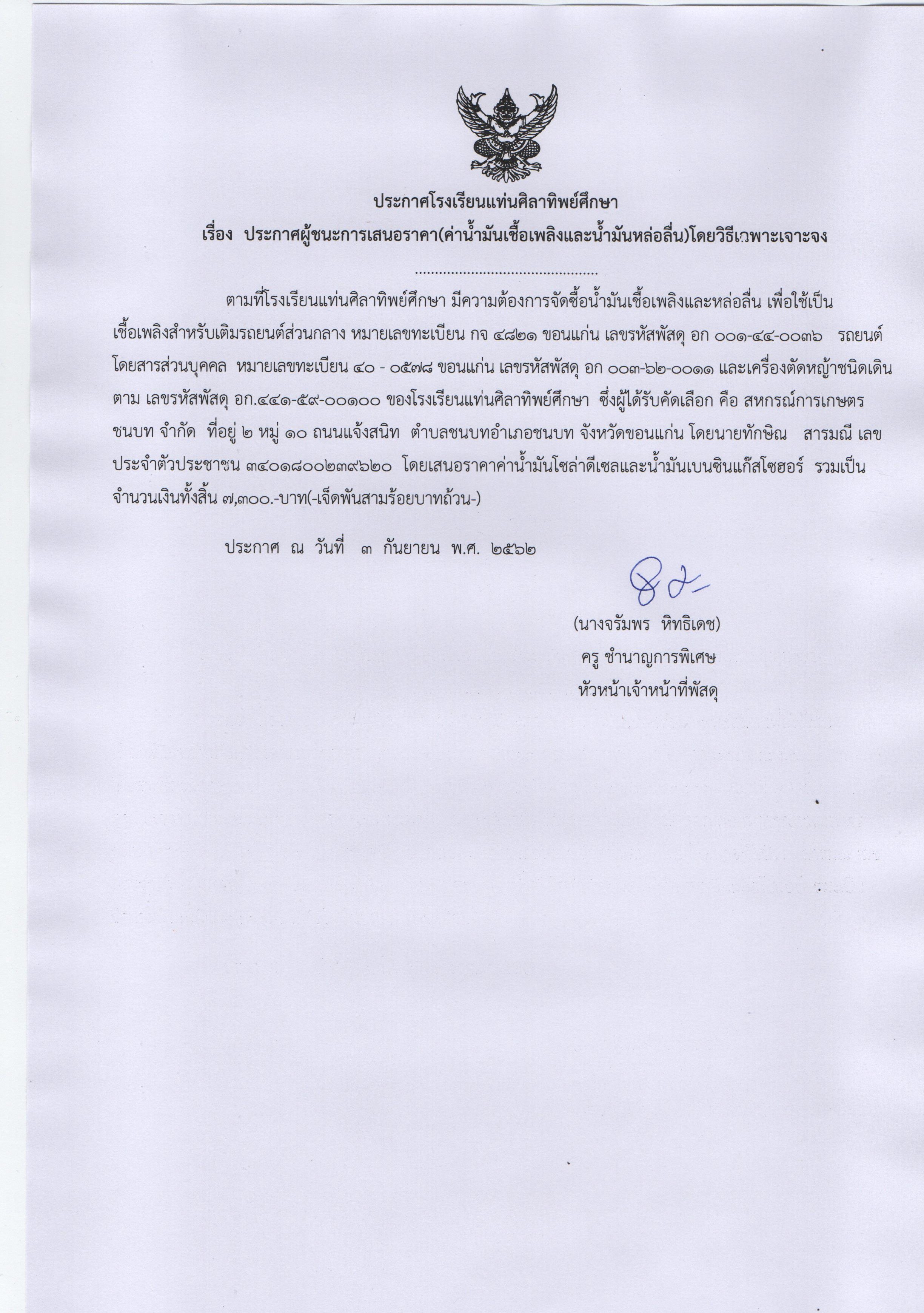 ประกาศโรงเรียนแท่นศิลาทิพย์ศึกษา เรื่อง ประกาศผู้ชนะการเสนอราคา(ค่าน้ำมันเชื้อเพลิงและน้ำมันหล่อลื่น)โดยวิธีเฉพาะเจาะจง