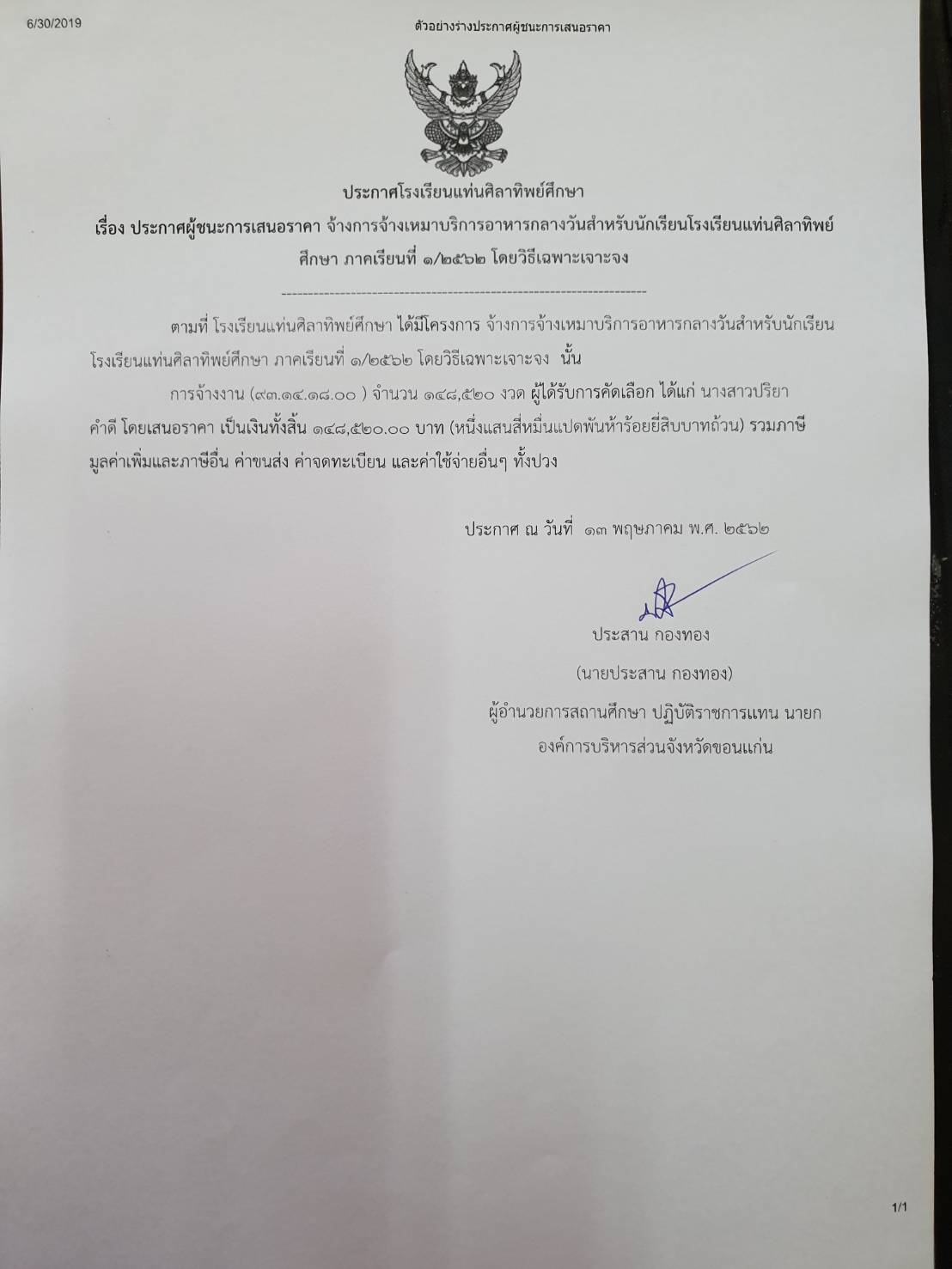 ประกาศผู้ชนะการเสนอราคาจ้างการจ้างเหมาบริการรถรับส่งนักเรียนโรงเรียนแท่นศิลาทิพย์ศึกษา ภาคเรียนที่ 1/2562 โดยวิธีเฉพาะเจาะจง
