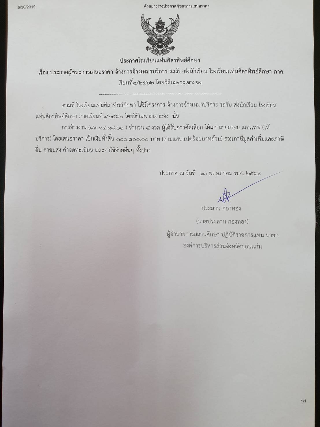 ประกาศผู้ชนะการเสนอราคาจ้างการจ้างเหมาบริการ รถรับ-ส่งนักเรียน โรงเรียนแท่นศิลาทิพย์ศึกษา ภาคเรียนที่ 1/2562 โดยวิธีเฉพาะเจาะจง