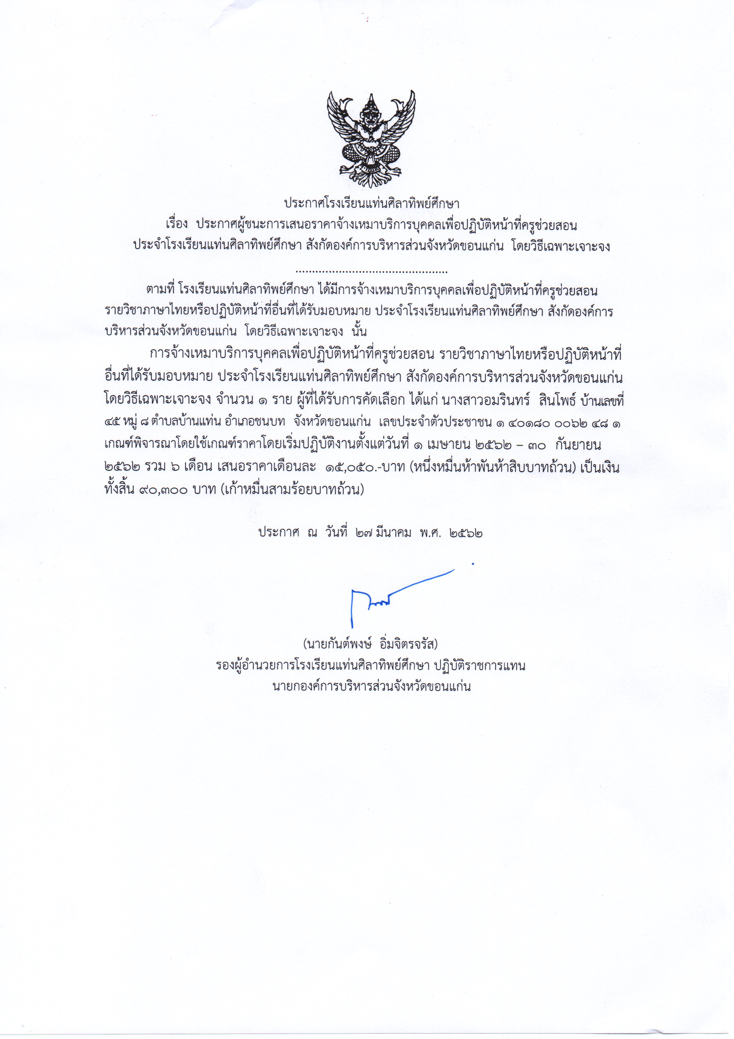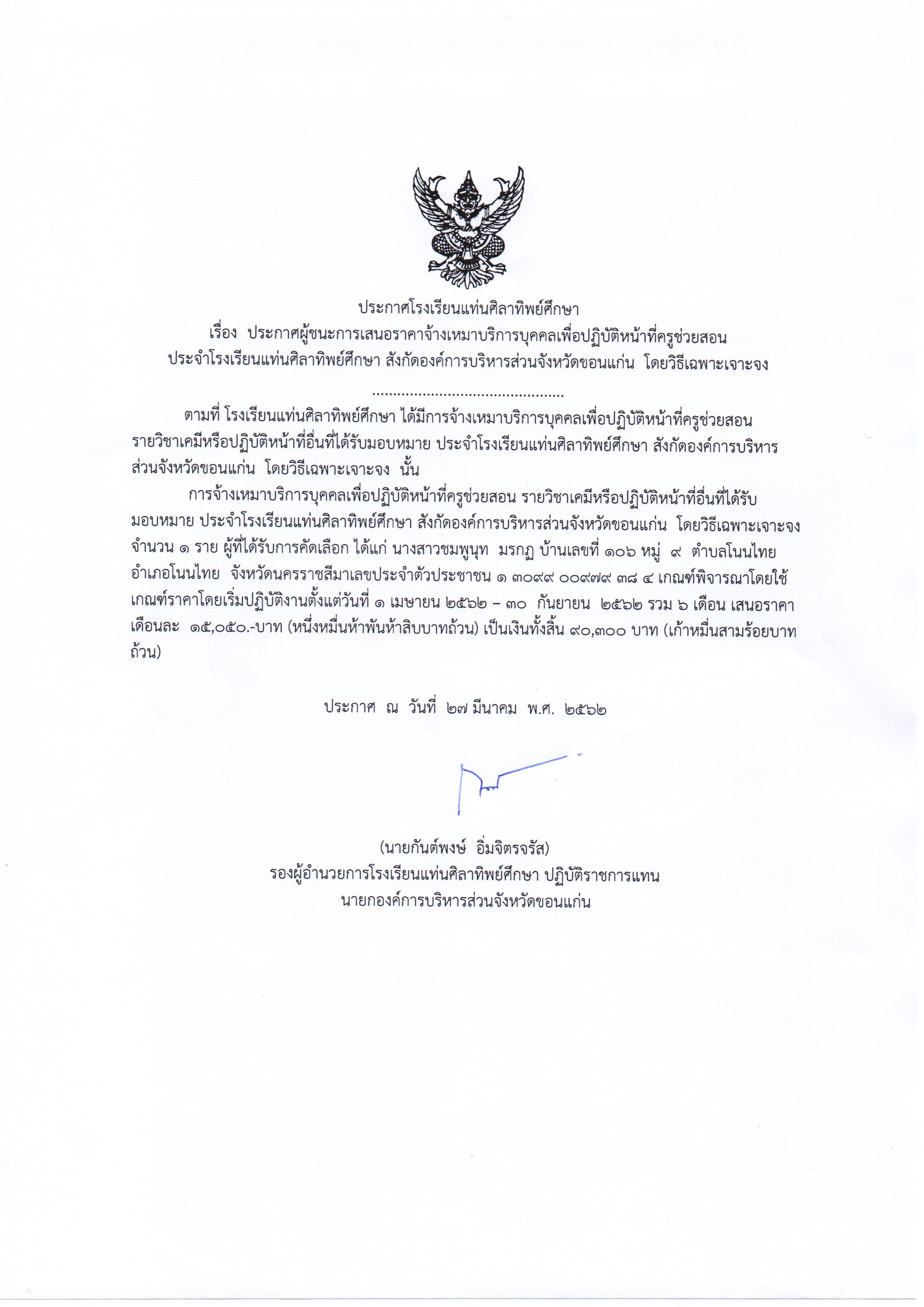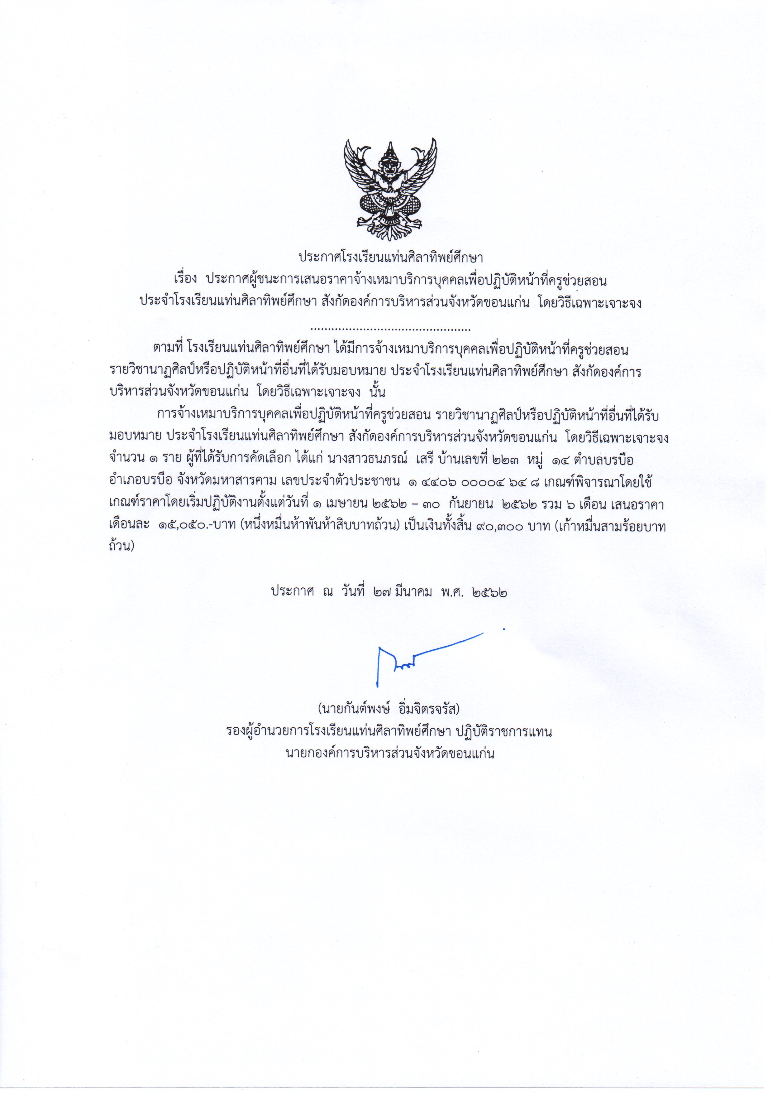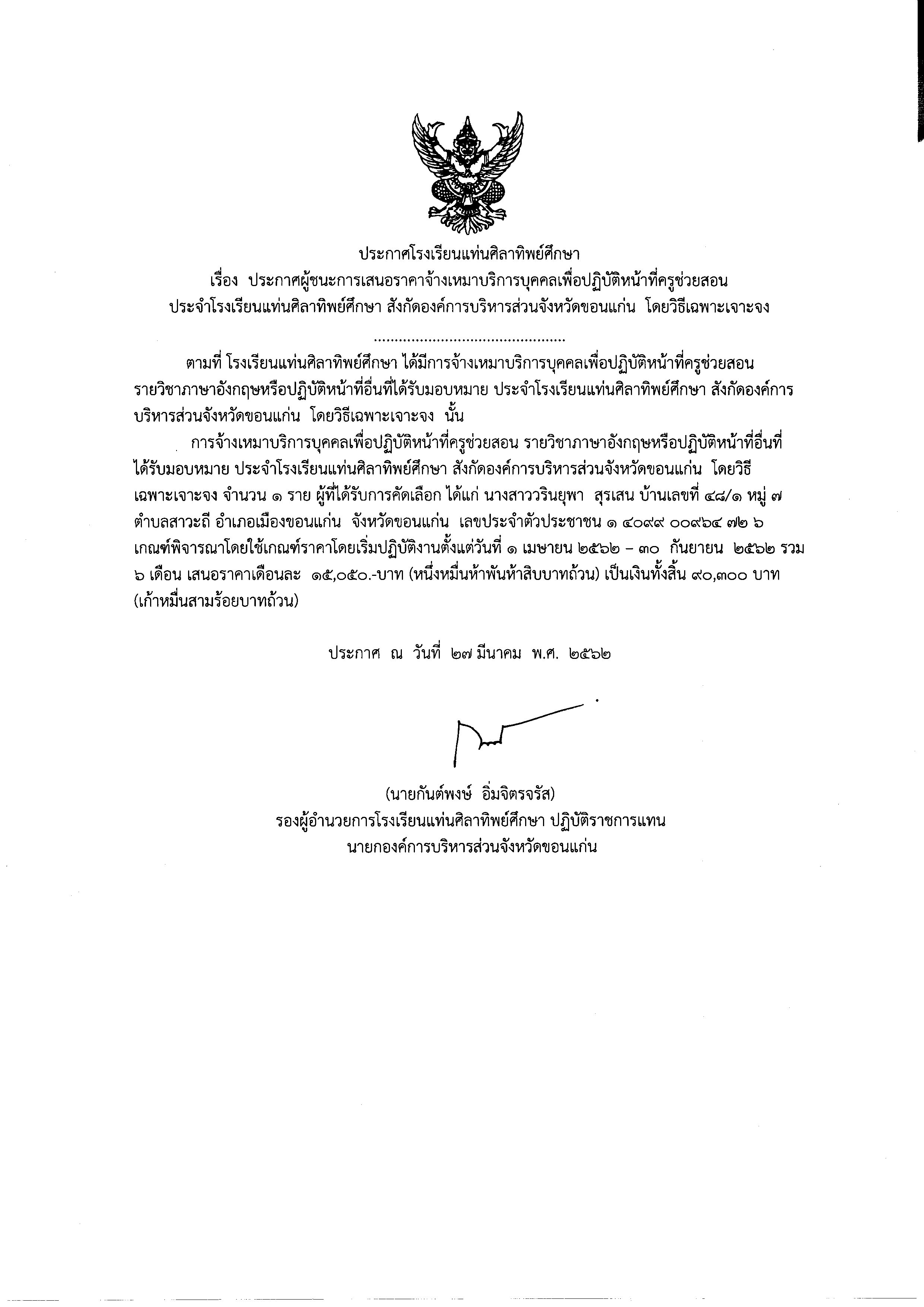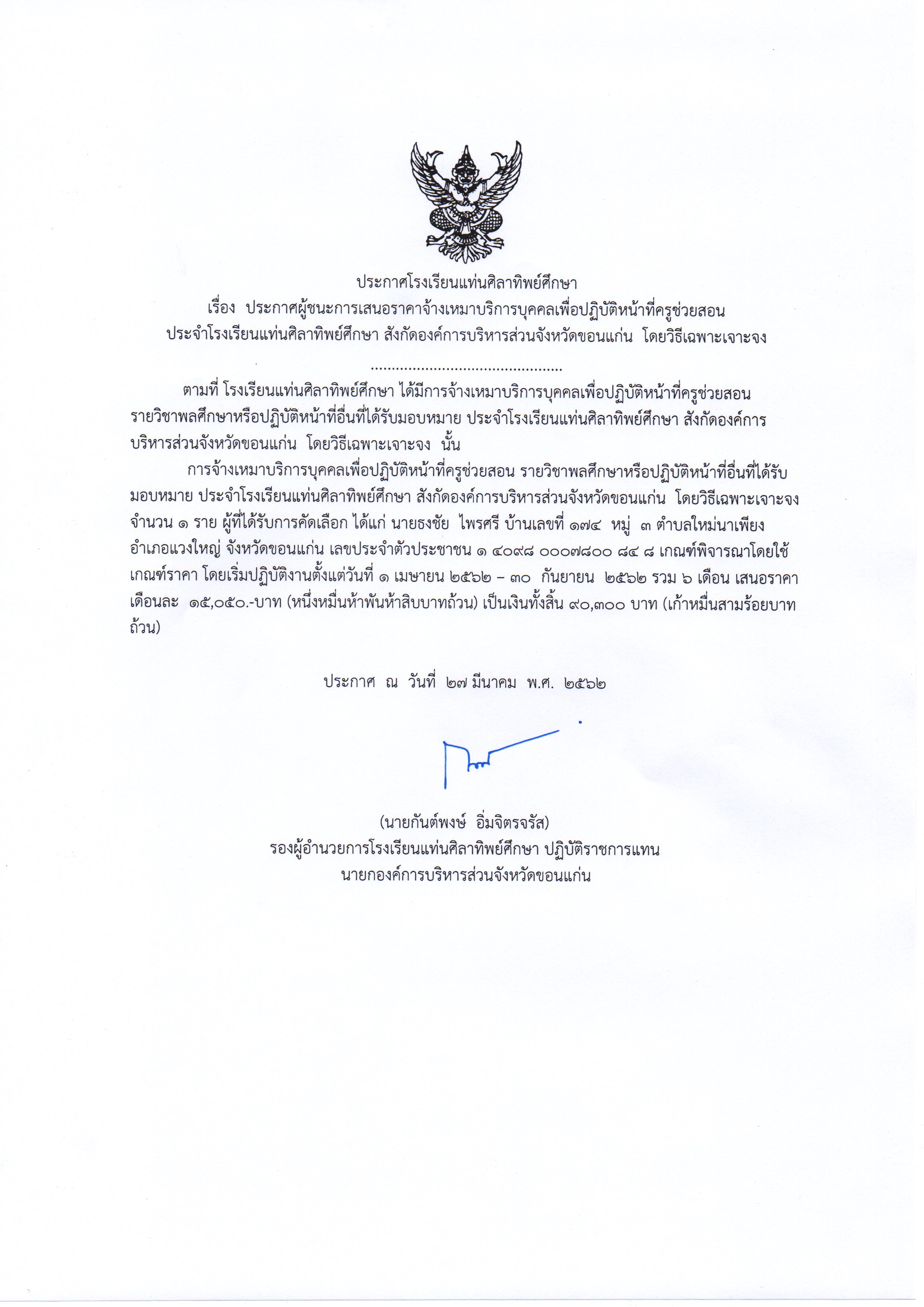 ประกาศผู้ชนะการเสนอราคาจ้างเหมาบริการบุคลเพื่อปฏิบัติหน้าที่ครูช่วยสอนประจำโรงเรียนเเท่นศิลาทิพย์ศึกษา สังกัดองค์การบริหารส่วนจังหวัดขอนเเก่น โดยวิธีเฉพาะเจาะจง ภาคเรียนที่1/2562 วิชาเอกภาษาไทย