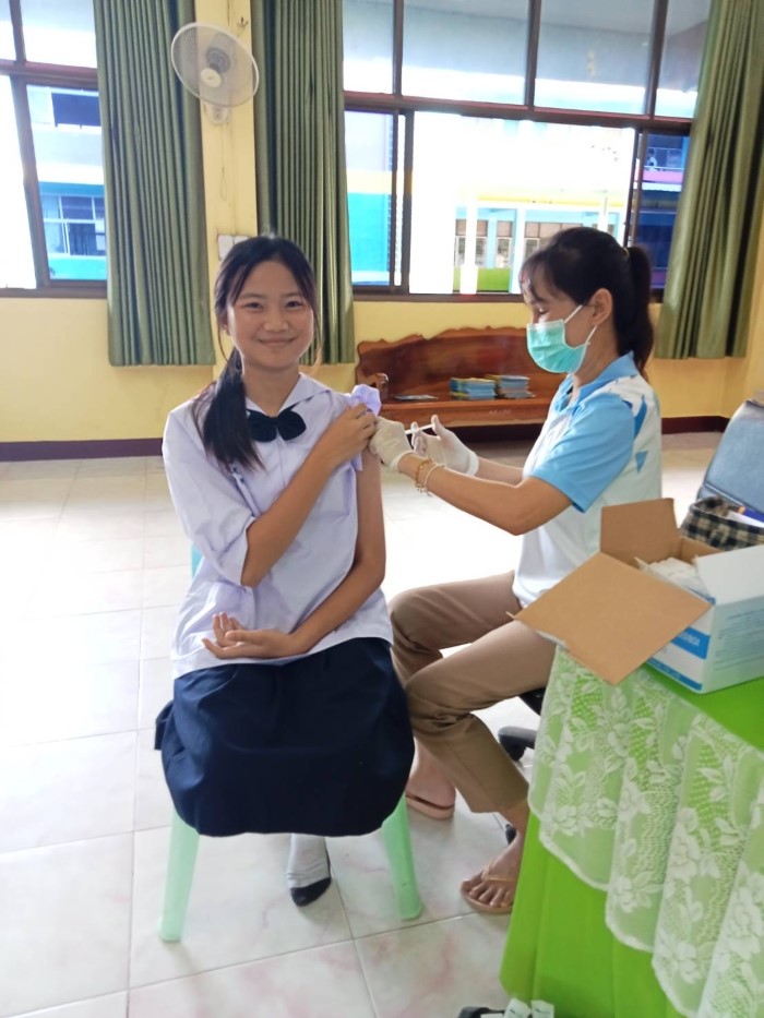 นักเรียนฉีดวัคซีนป้องกันมะเร็งปากมดลูกสำหรับนักเรียนหญิง ม.ต้น เพื่อป้องกันการเกิดโรคมะเร็งปากมดลูกซึ่งมีสาเหตุมาจากการติดเชื้อเอชพีวี