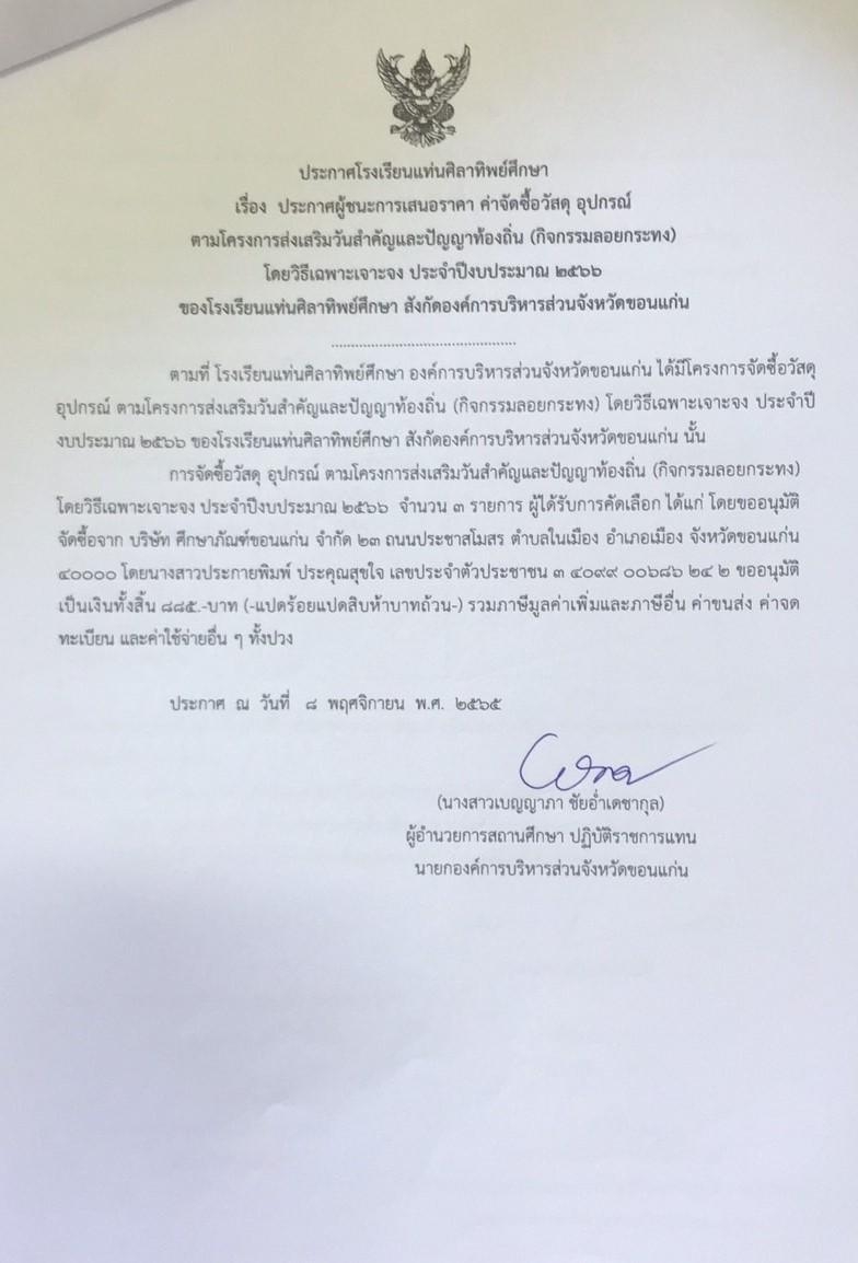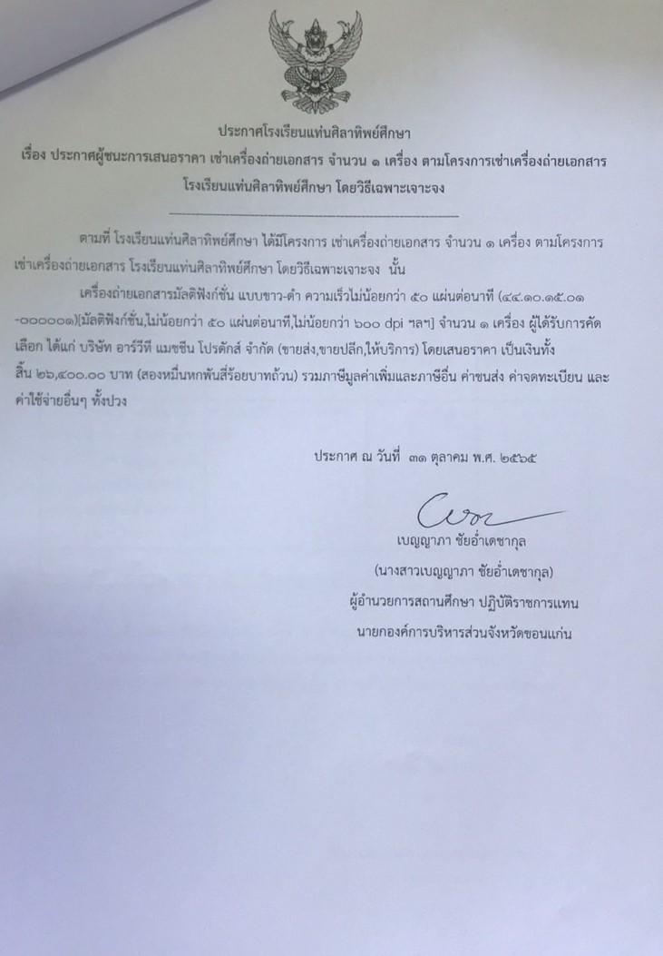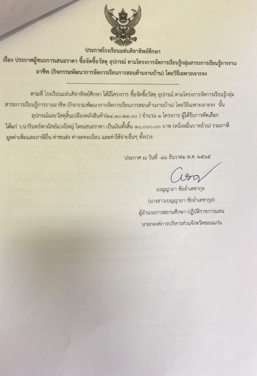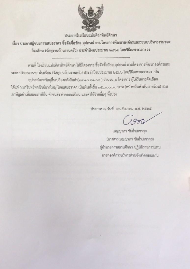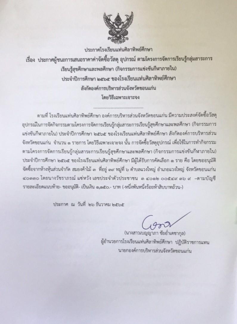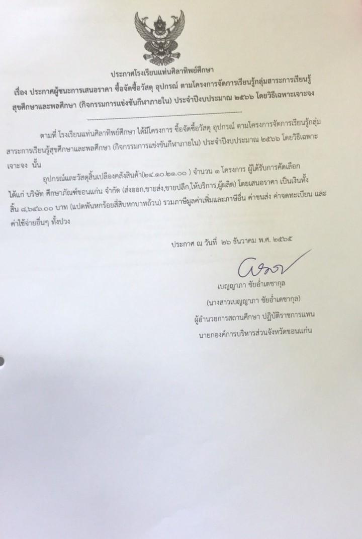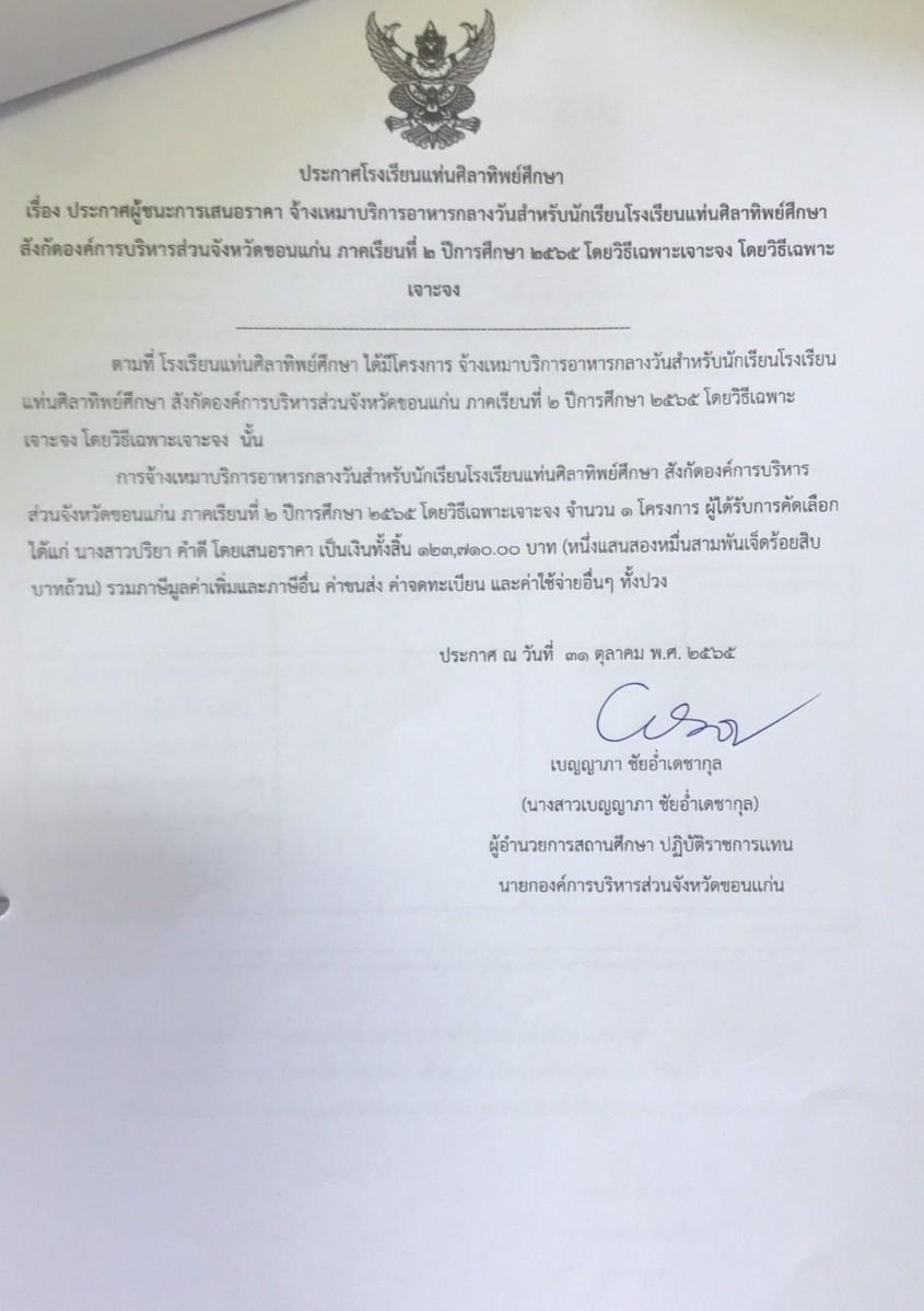 ประกาศผู้ชนะการเสนอราคา จ้างเหมาบริการอาหารกลางวันสำหรับนักเรียนโรงเรียนแท่นศิลาทิพย์ศึกษา สังกัดองค์การบริหารส่วนจังหวัดขอนแก่น
