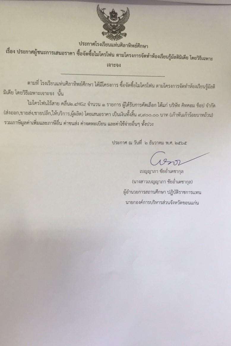 ประกาศผู้ชนะการเสนอราคา ซื้อจัดซื้อไมโครโฟน ตามโครงการจัดทำห้องเรียนรู้มัลติมิเดีย โดยวิธีเฉพาะเจาะจง
