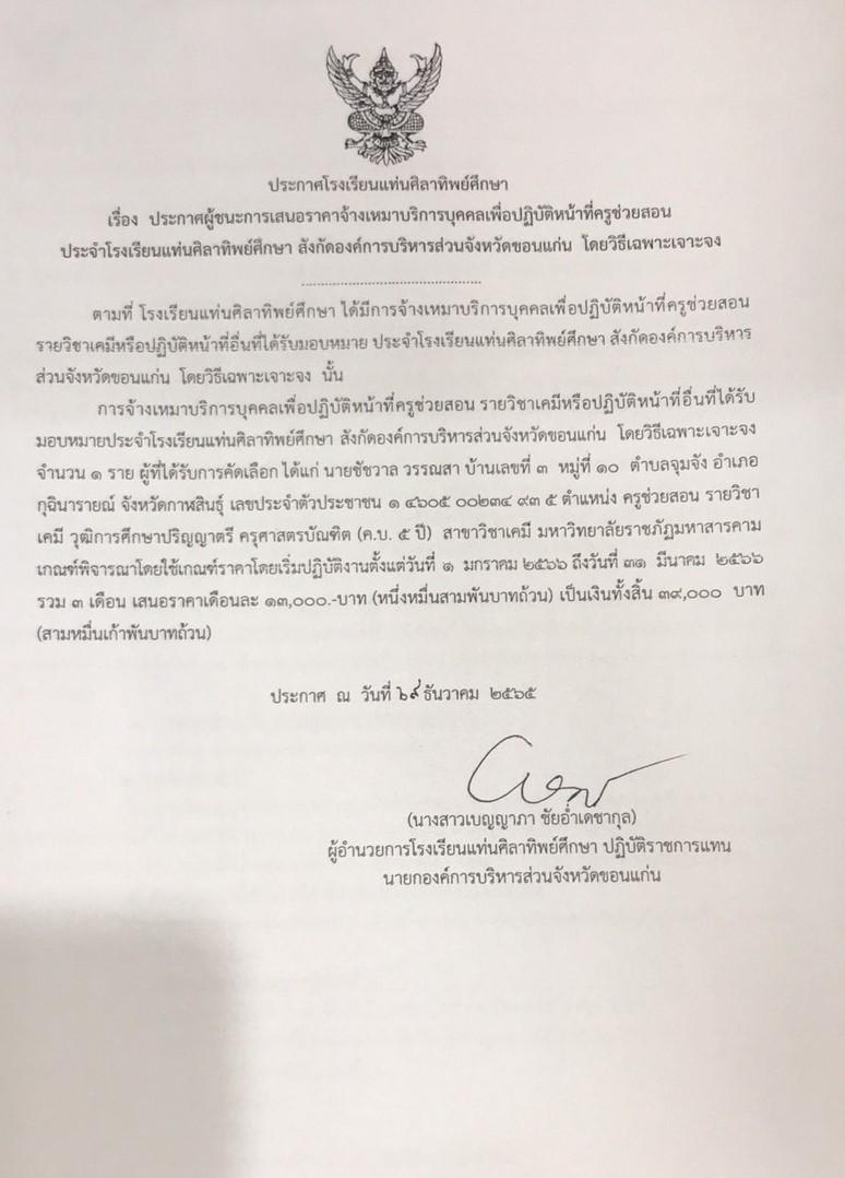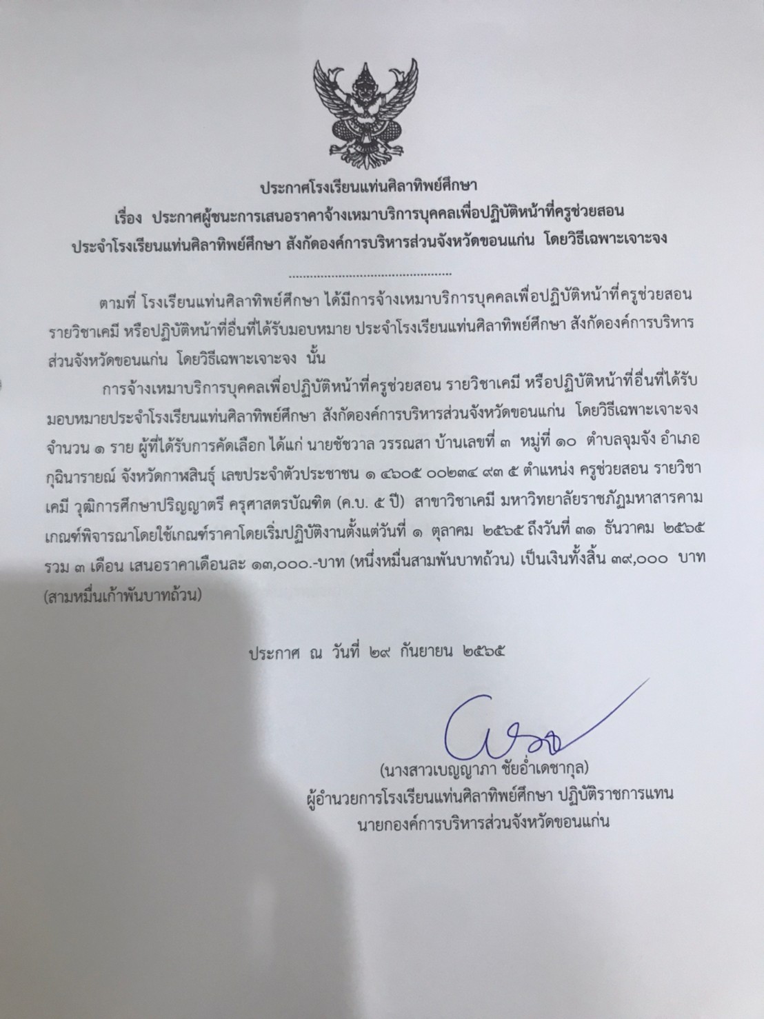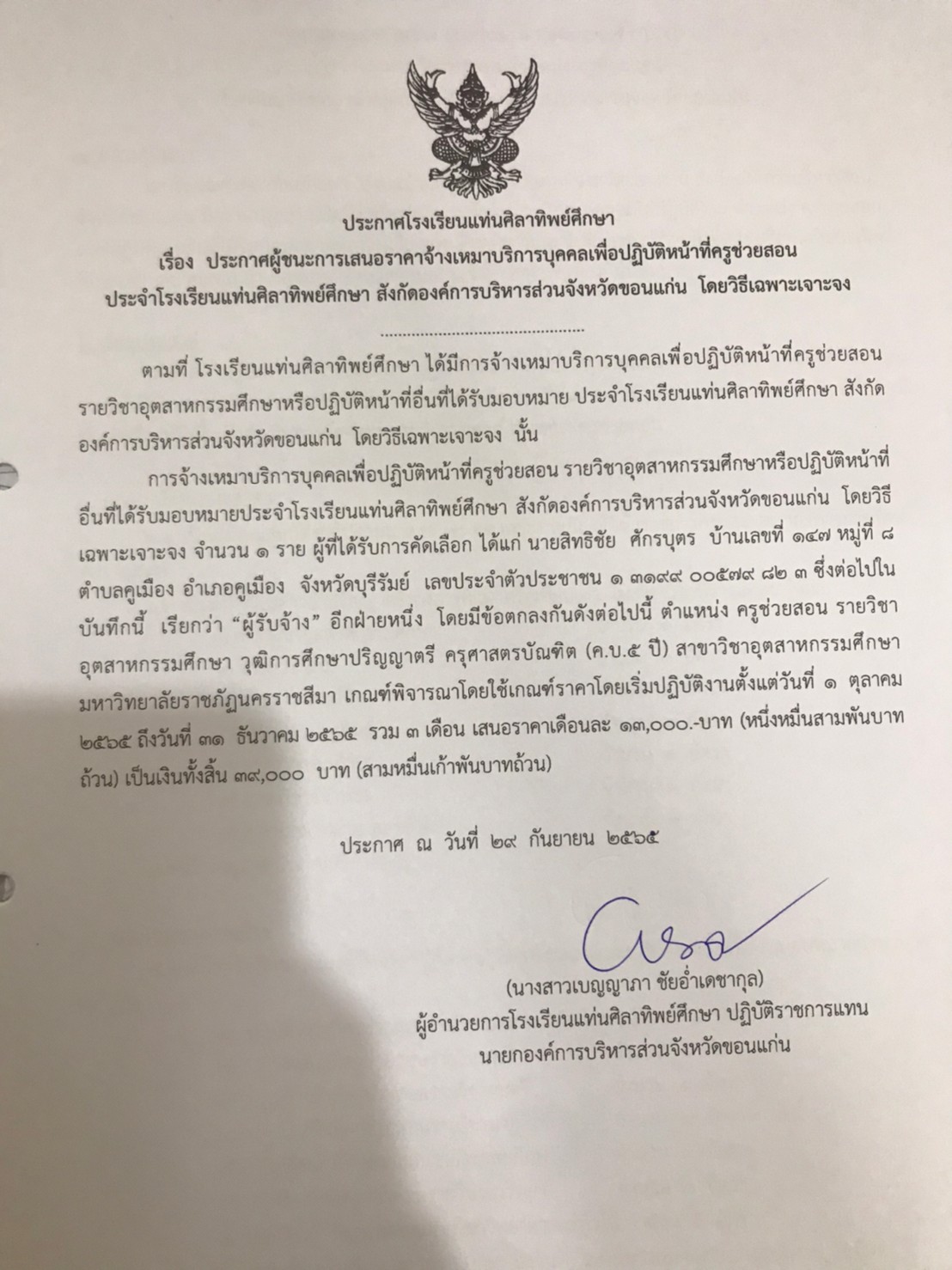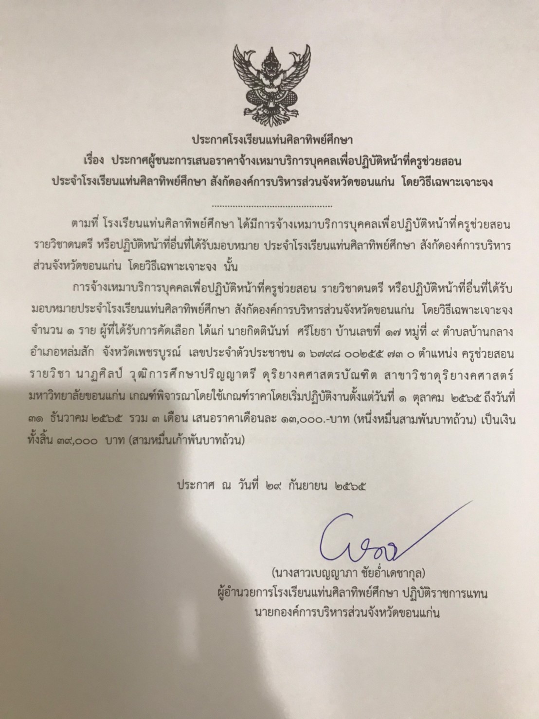 ประกาศผู้ชนะการเสนอราคา จ้างเหมาบริการบุคคลเพื่อปฏิบัติหน้าที่ครูช่วยสอนประจำโรงเรียนแท่นศิลาทิพย์ศึกษา