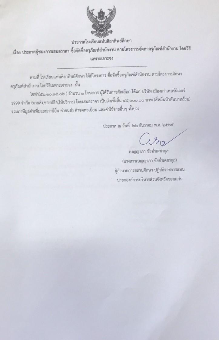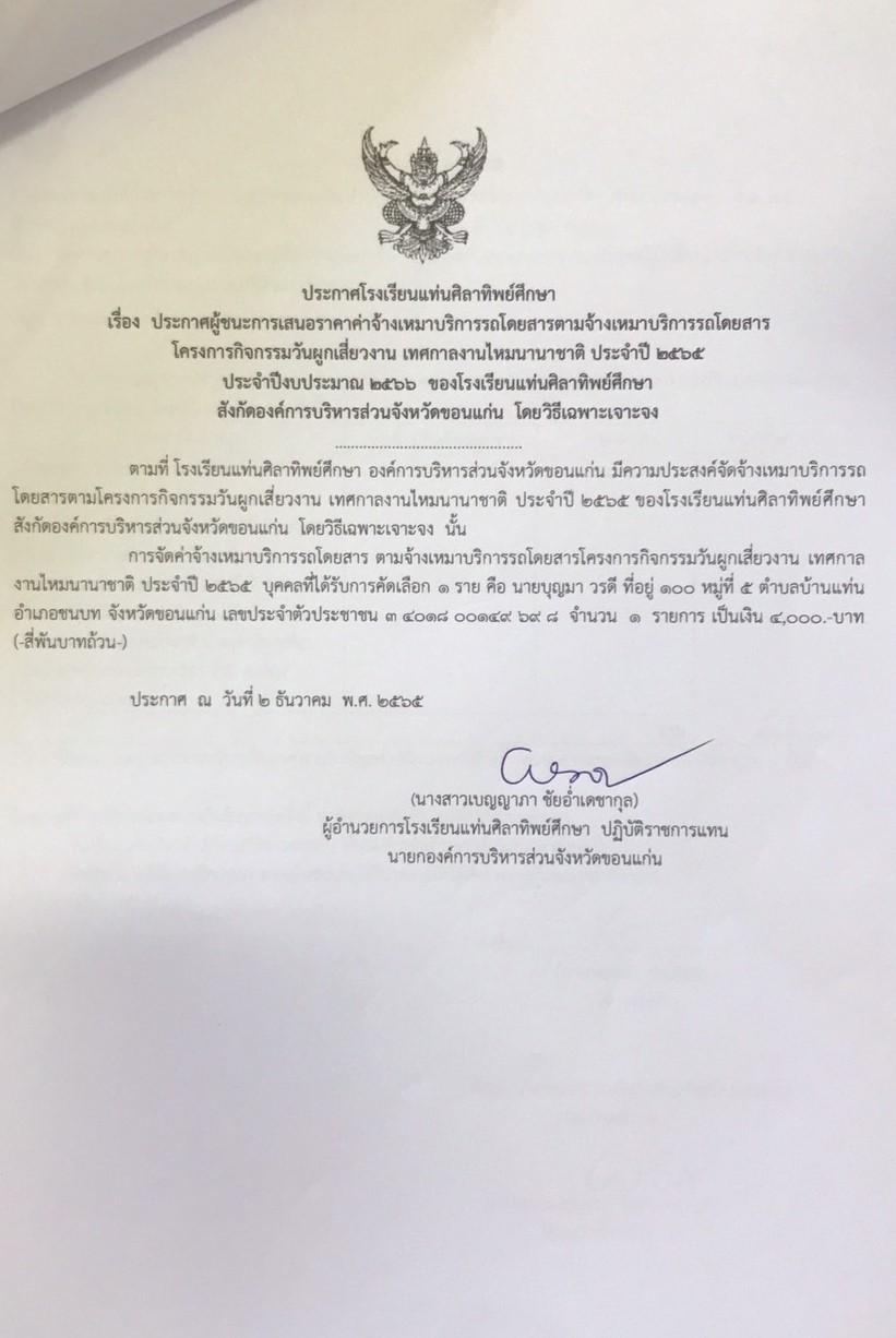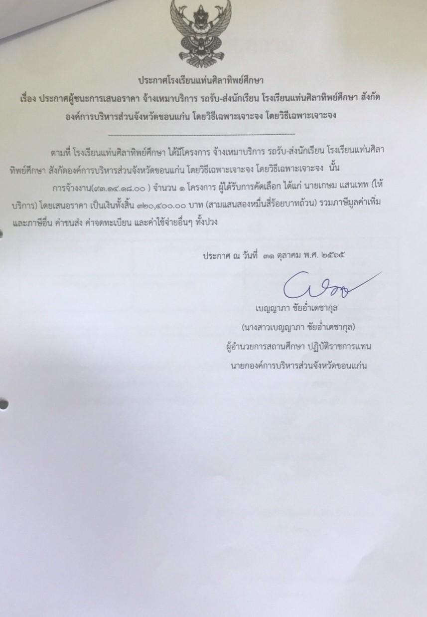 ประกาศผู้ชนะการเสนอราคา จ้างเหมาบริการ รถรับ-ส่งนักเรียน โรงเรียนแท่นศิลาทิพย์ศึกษา สังกัดองค์การบริหารส่วนจังหวัดขอนแก่น โดยวิธีเฉพาะเจาะจง