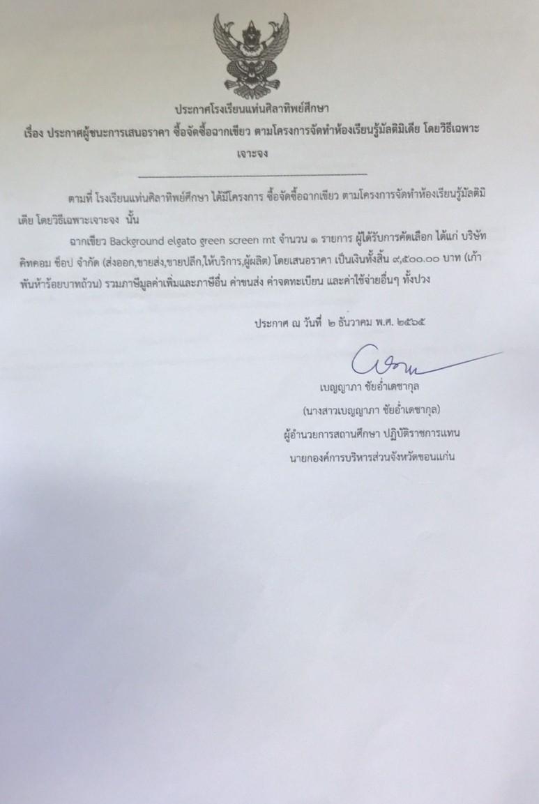 ประกาศผู้ชนะการเสนอราคา ซื้อจัดซื้อฉากเขียว ตามโครงการจัดทำห้องเรียนรู้มัลติมิเดีย โดยวิธีเฉพาะเจาะจง