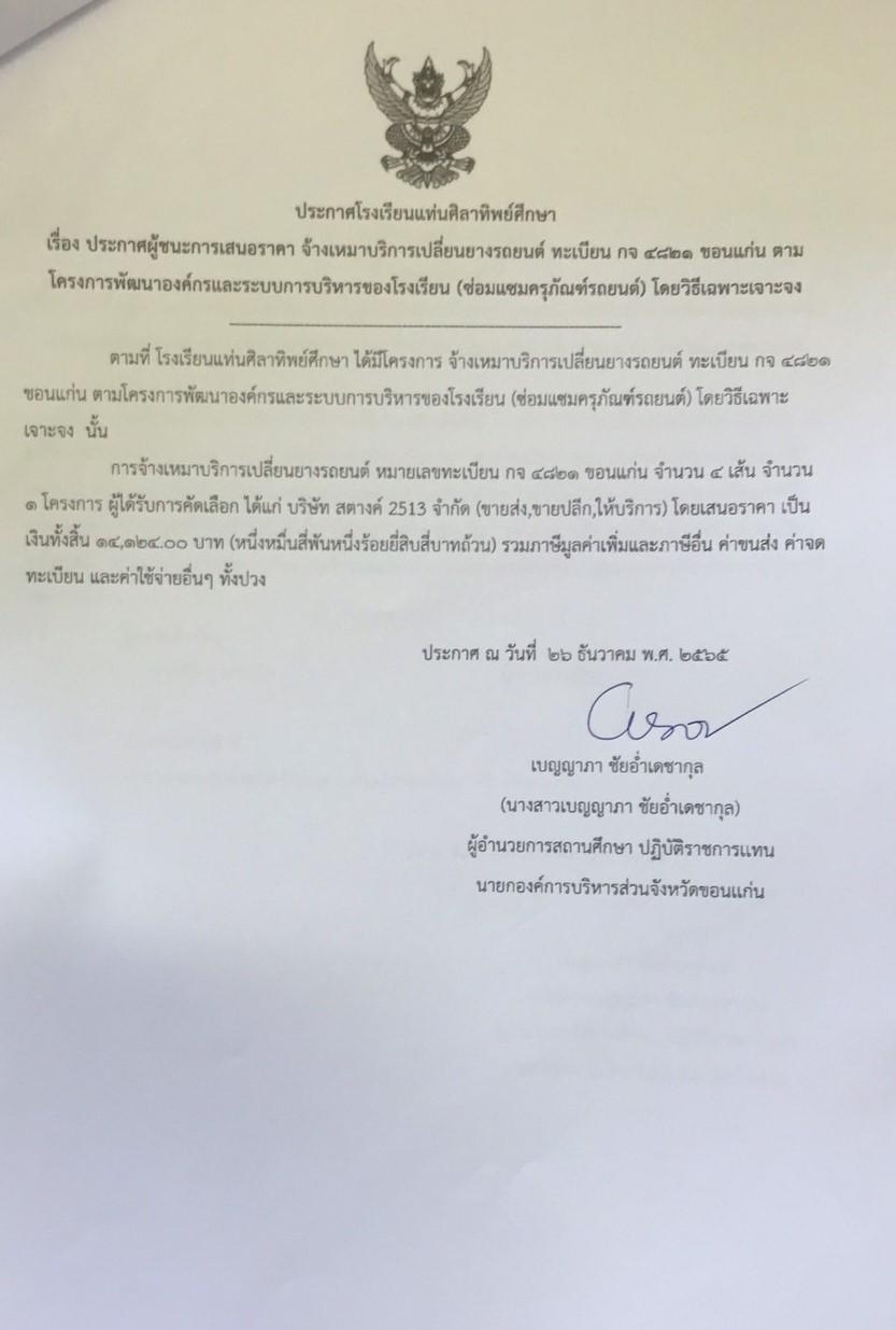 ประกาศผู้ชนะการเสนอราคา จ้างเหมาบริการเปลี่ยนยางรถยนต์ ทะเบียน กจ ๔๘๒๑ ขอนแก่น ตามโครงการพัฒนาอง์กรและระบบการบริหารของโรงเรียน (ซ่อมแซ่มครุภัณฑ์รถยนต์)
