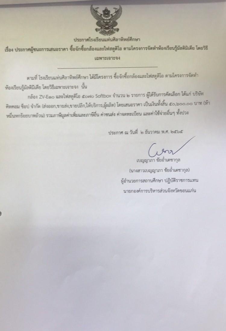 ประกาศผู้ชนะการเสนอราคา ซื้อจัดซื้อกล้องและไฟสตูดิโอ ตามโครงการจัดทำห้องเรียนรู้มัลติมิเดีย โดยวิธีเฉพาะเจาะจง