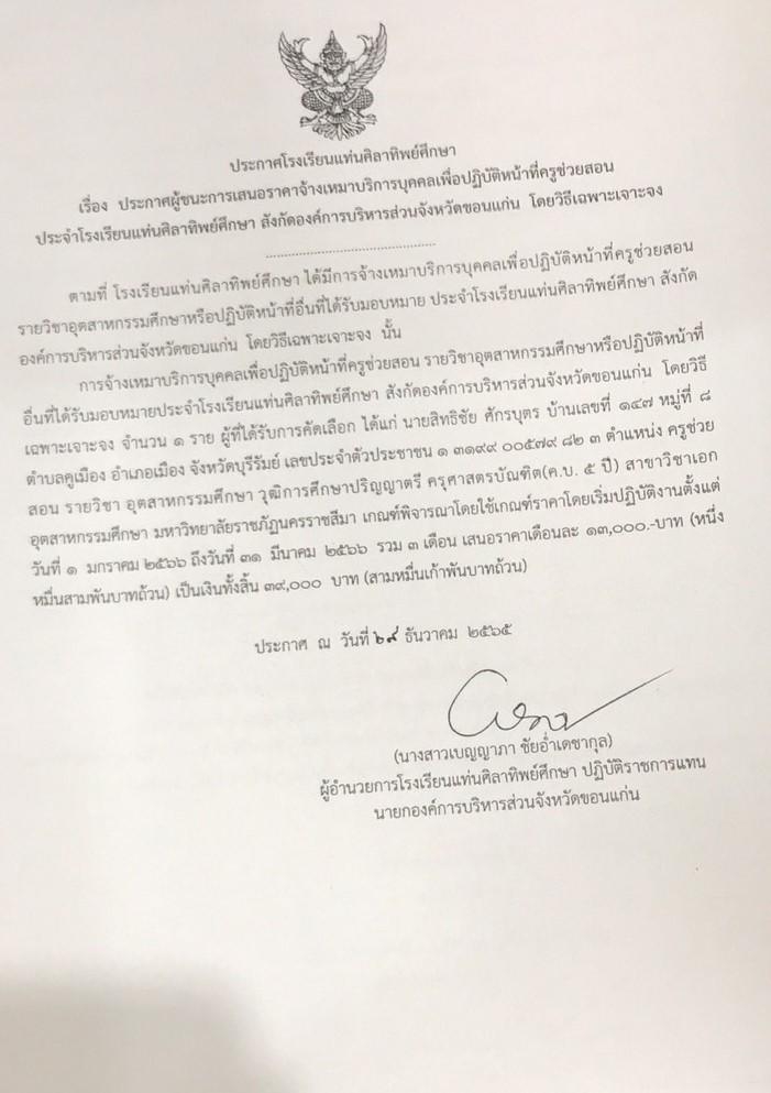 ประกาศผู้ชนะการเสนอราคา จ้างเหมาบริหารบุคคลเพื่อปฏิบัติหน้าที่ ตำแหน่ง ครูสนับสนุนการสอน(ผู้ช่วยเจ้าหน้าที่พัสดุ) โดยวิธีเฉพาะเจาะจง 26 ก.ค. 2565