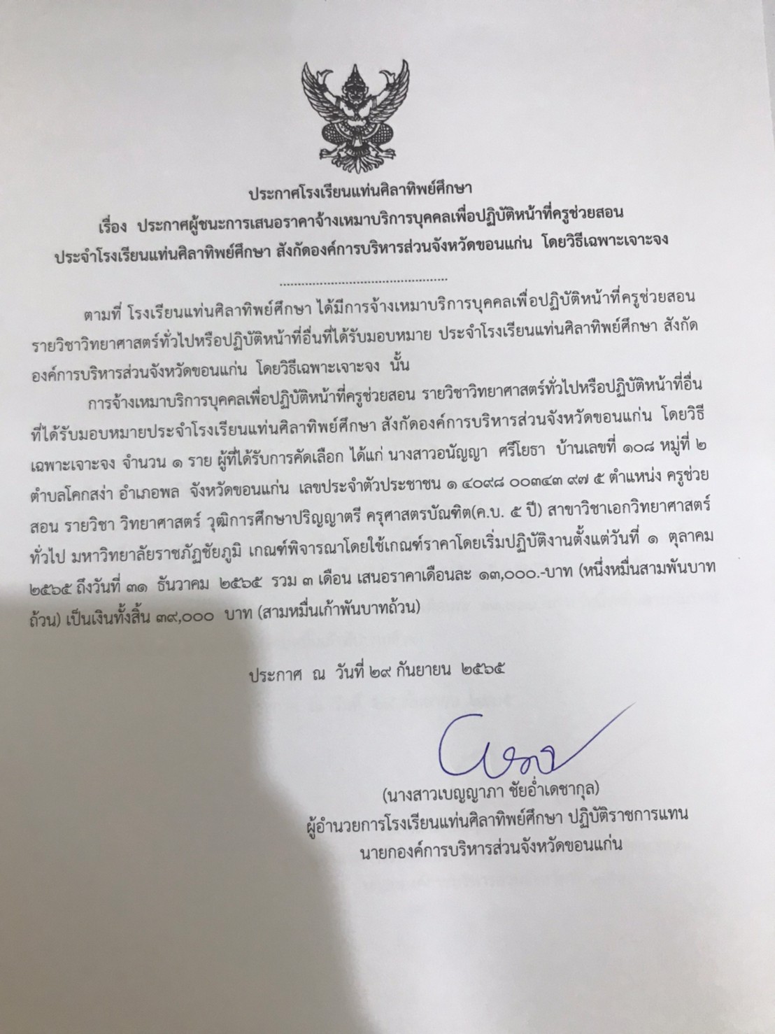 ประกาศผู้ชนะการเสนอราคา จ้างเหมาบริการบุคลากรเพื่อปฏิบัติหน้าที่ครูช่วยสอน วิชาเอกเคมี ตามโครงการจ้างเหมาบริการ ประจำปีงบประมาณ 2566 วันที่29 กันยายน 2565