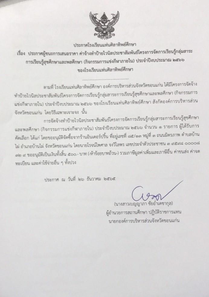 ประกาศผู้ชนะการเสนอราคา ค่าจ้างทำป้ายประชาสัมพันธ์โครงการจัดการเรียนรู้กลุ่มสาระการเรียนรู้สุขศึกษาและพลศึกษา (กิจกรรมแข่งขันกีฬาภายใน) ประจำปีงบประมาณ ๒๕๖๕ โรงเรียนแท่นศิลาทิพย์ศึกษา