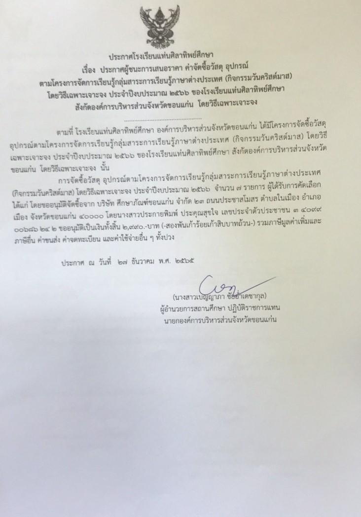 ประกาศผู้ชนะการเสนอราคา ค่าจัดซื้อวัสดุ อุปกรณ์ ตามโครงการจัดการเรียนรู้กลุ่มสาระการเรียนรู้ภาษาต่างประเทศ (กิจกรรมวันคริสต์มาส) โดยวิธีเฉพาะเจาะจง ประจำปีการศึกษา ๒๕๖๖